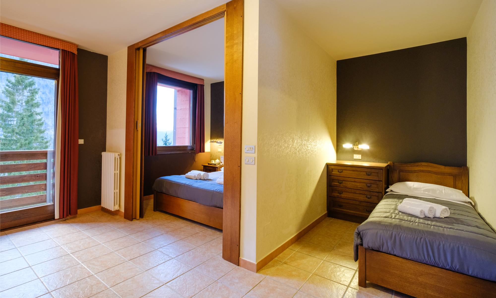 Each Comfort Large Room is spacious, furnished with wooden interiors, and equipped with a balcony, television, Wi-Fi, heating, and a safe. Some of our Comfort Rooms feature an internal alcove with a double bed and room divider, ensuring maximum comfort for families on holiday.