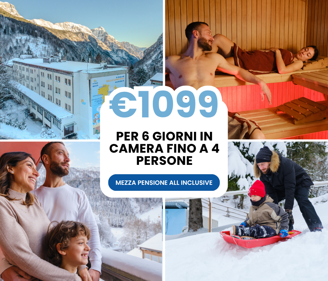 IscrivitiOfferta 6 giorni con skipass under 18 inclusi in mezza pensione all inclusive dal 1 al 7 marzo a €1099 fino a 4 persone in camera.